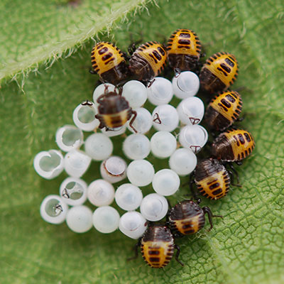 Рис. 9. Молодые нимфы коричневого мраморного клопа, выходящие из яиц.