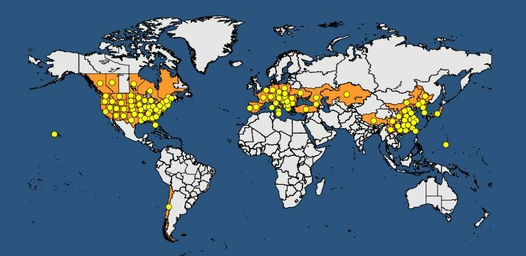 Коричневый мраморный вонючий клоп (Halyomorpha halys) был впервые обнаружен в Соединенных Штатах в 2001 году из экземпляра, собранного в 1998 году в Аллентауне, штат Пенсильвания. Это хорошо известный автостопщик в грузовых автомобилях, грузовиках, самолетах и вагонах, путешествующий из города в город, где он может быстро создавать новые популяции.