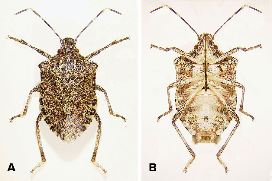 Взрослые особи коричневого мраморного клопа-вонючки имеют типичную для клопов форму щита. Они примерно 15 мм (5/8 дюйма) в длину и 8 мм (3/8 дюйма) в ширину, что примерно соответствует размеру ногтя большого пальца человека. Верхняя сторона тела имеет пестрые оттенки коричневого и серого и покрыта плотными точками (рис. 7А). Нижняя сторона тела белая, иногда с серыми или черными отметинами (рис. 7Б). У них темные, красновато-коричневые глаза. Ноги коричневые с едва заметными белыми полосами.