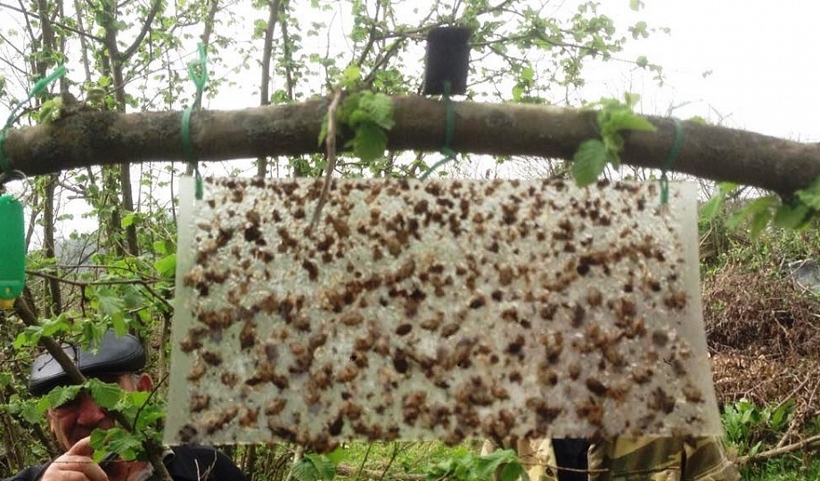 Рисунок 13. Ловушки с липкой панелью, показывающая двойные приманки с феромонами, закрепленные над панелью.