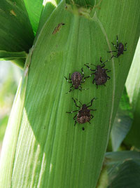 На полевой кукурузе клопы-вонючки питаются преимущественно развивающимися зернами внутри початка, вставляя свои колющие ротовые части через шелуху. Это оставляет ядра с усохшим внешним видом.