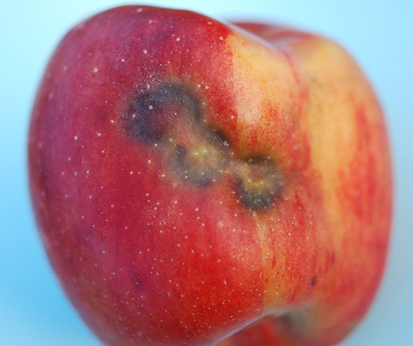 Рисунок 2. Повреждение коричневым мраморным клопом на поверхности плода яблони.