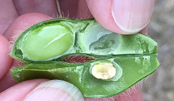 У соевых бобов повреждения обнаруживаются на семенах внутри стручков во время наполнения стручков (Рисунок 6). Раннее повреждение приводит к тому, что семена не развиваются, а более поздняя подкормка вызывает сморщивание семян. Травмы наиболее распространены на краях полей, что приводит к синдрому «оставаться зеленым» по краям поврежденных полей, потому что подкормка задерживает созревание урожая и опадение листьев.